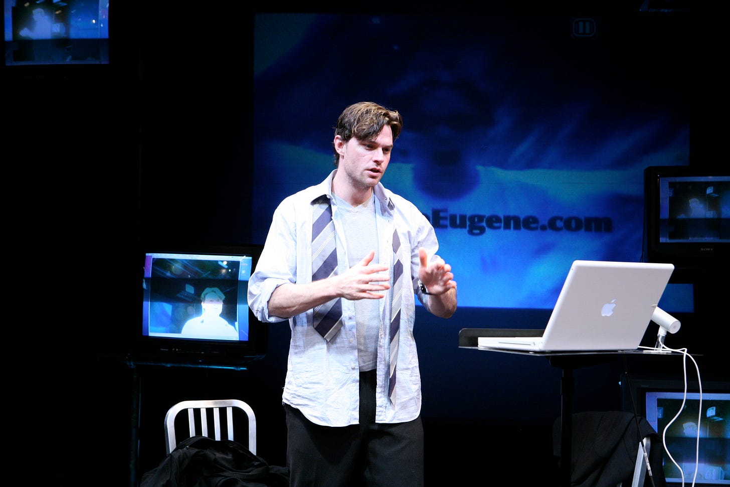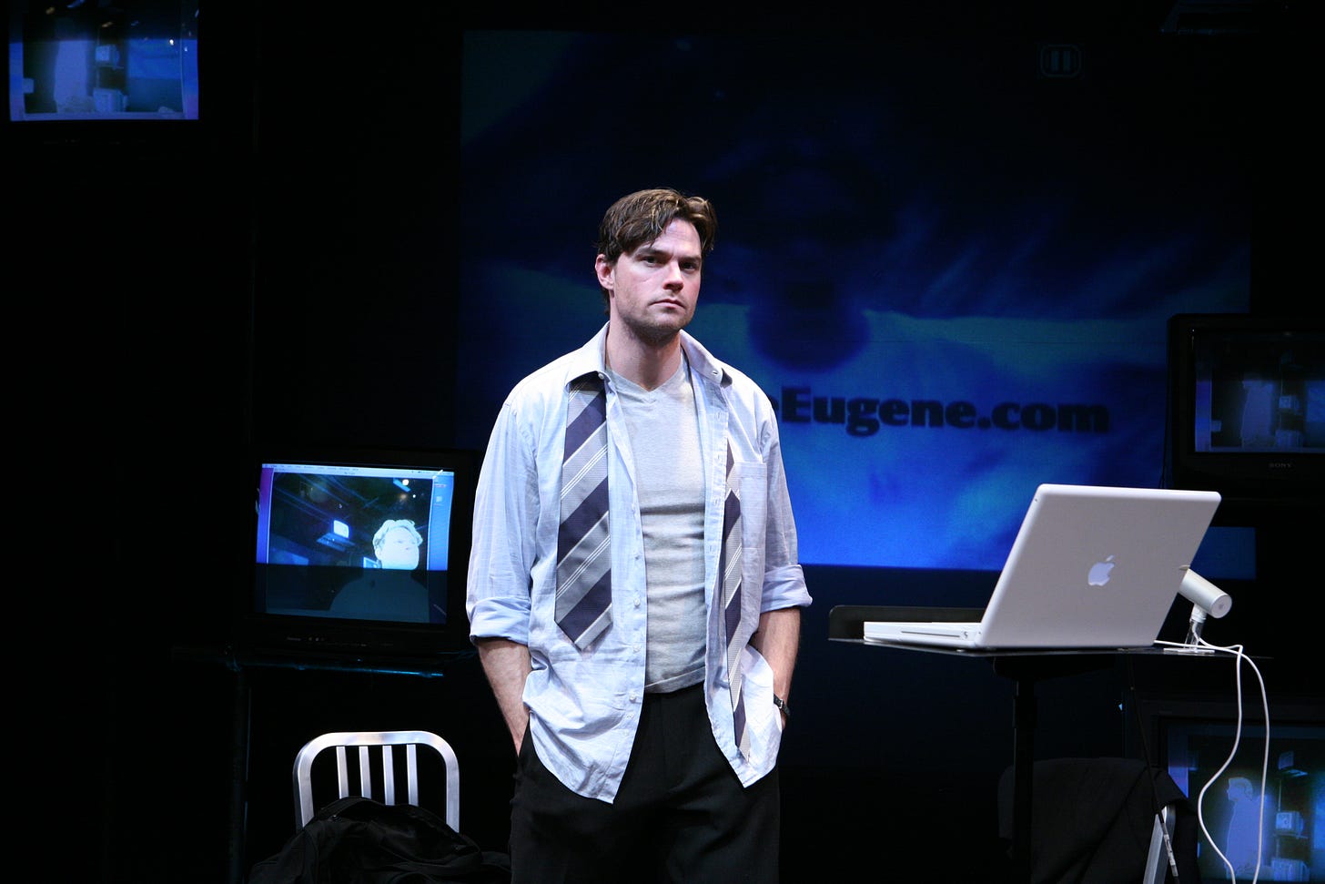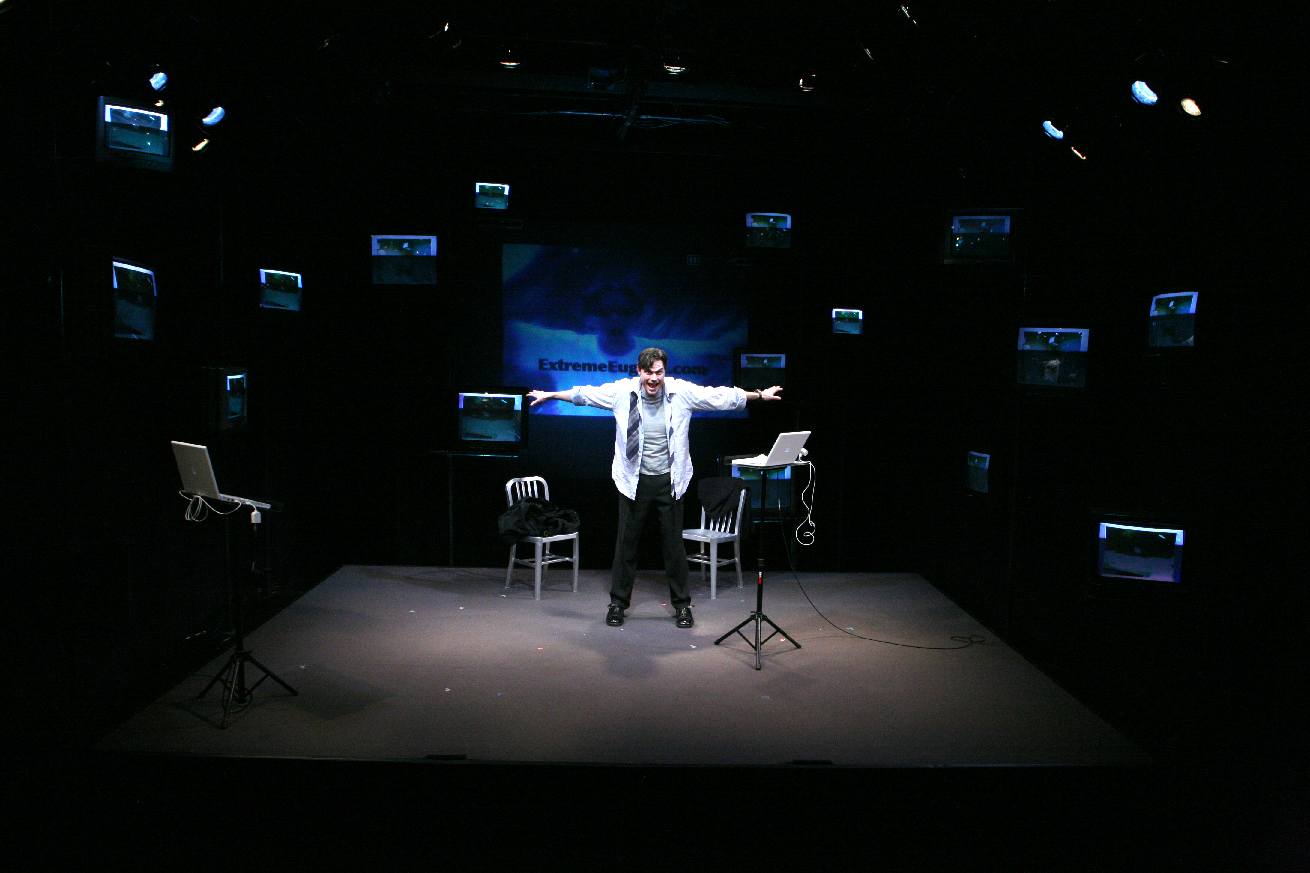Eugene, a man dressed in a business suit and carrying a briefcase, steps out and sets his briefcase down. He is pointing a gun at the audience.